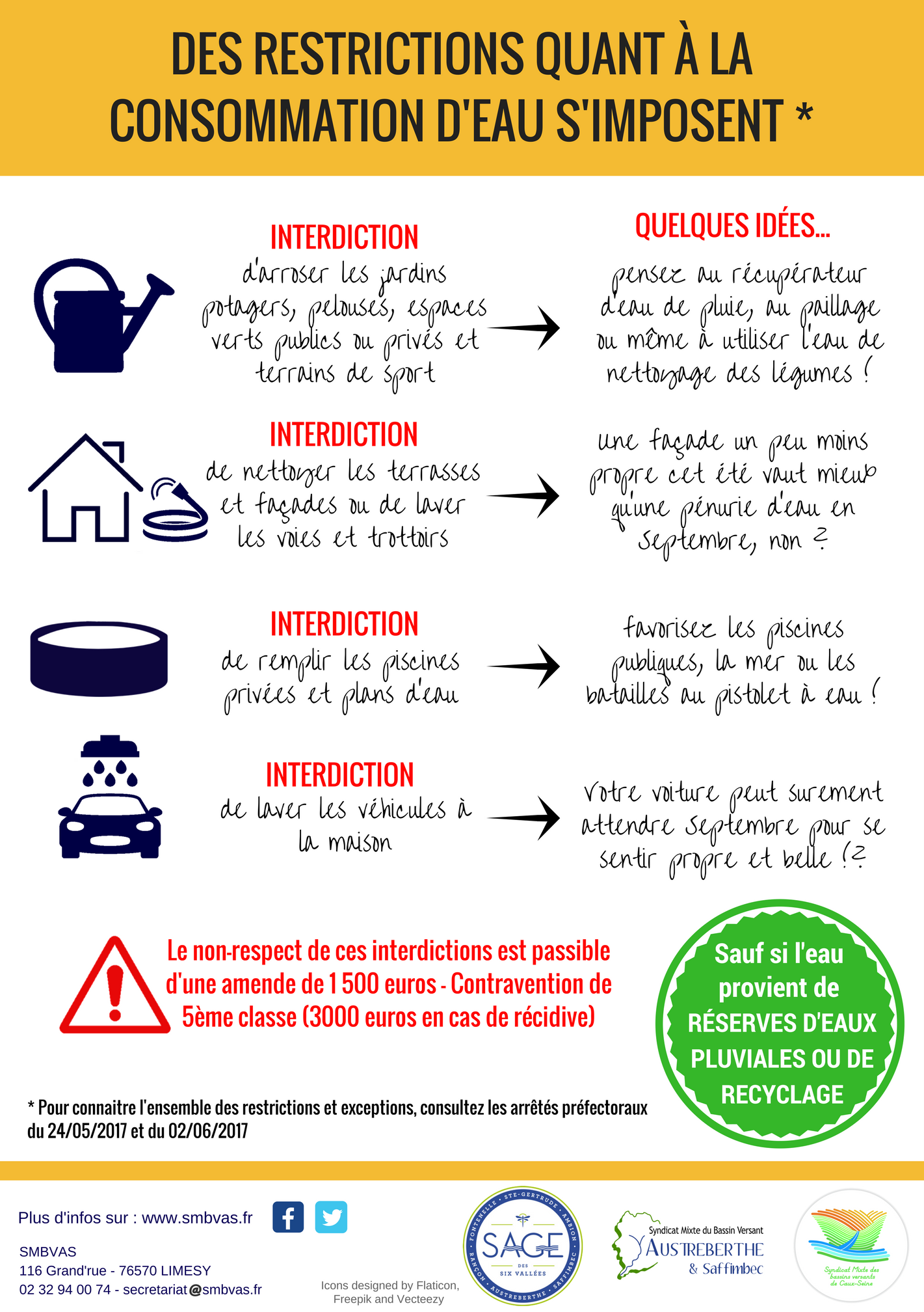 Notre commune, et plus largement notre département, connaît une situation de sécheresse rarissime. Les deux syndicats de bassins versants auxquels notre commune adhère ont récemment émis un message d’alerte conjoint. Ainsi, ils rappellent l’importance de respecter les mesures d’interdiction mises en place. Pour cela, ils ont mis au point un support de communication spécifique, que vous trouverez en images ci-dessous.